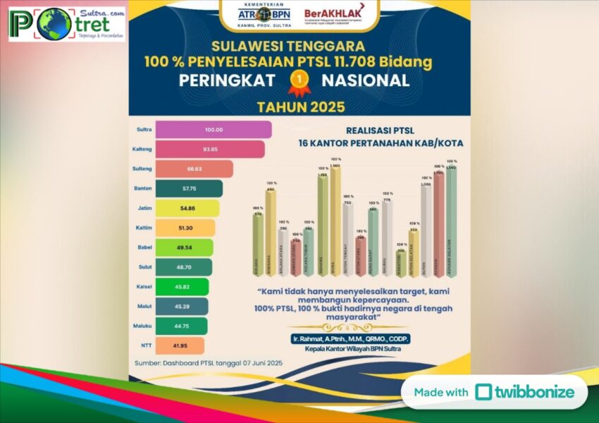 KENDARI – Provinsi Sulawesi Tenggara kembali mencetak prestasi gemilang dengan berhasil menyelesaikan 100 persen kegiatan Pendaftaran Tanah Sistematis Lengkap (PTSL) Tahun 2025, dan sukses menempati peringkat pertama secara nasional.