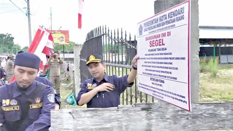 Penyegelan oleh Dinas PUPR Kota Kendari di RTH Jalan ZA Sugianto. Foto: Istimewa.