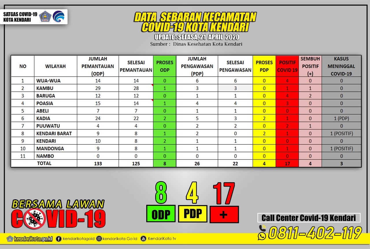 KENDARI– Gugus Tugas penanagan Virus Corona Disiase (Covid 19) Kota Kendari mengumumkan secara resmi jumlah pasien yang positif Covid 19 di Kota Kendari sebanyak 23 orang, 17 masih dalam perawatan 4 sembuh dan 2 meninggal dunia.Tak hanya itu Kota Kendari sudah masuk Zona merah dan juga wilayah tramisi lokal.