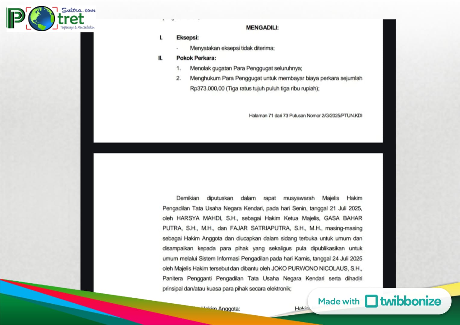 Ia menambahkan, setelah beberapa kali dilakukan persidangan di PTUN Kendari, hingga akhirnya Ketua Majelis Hakim memutus dan mengadili perkara ini dengan menyatakan eksepsi tidak diterima, dan menolak gugatan para penguggat untuk seluruhnya.