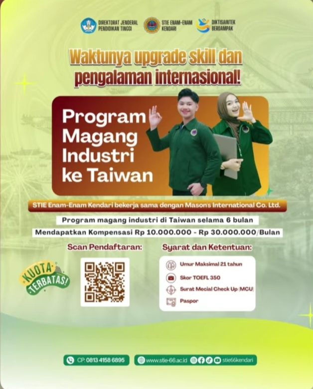 KENDARI – Sekolah Tinggi Ilmu Ekonomi Enam-Enam (STIE-66) Kendari membuka peluang baru bagi mahasiswanya melalui program magang Industri di Taiwan.