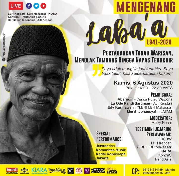 Agenda Mengenang Laba’a ini akan dipandu langsung oleh Melky Nahar sebagai moderator dengan menghadirkan sejumlah pembicara yakni Abarudin (warga Pulau Wawonii), La Ode Pandi Sartiman (AJI Kendari), Edy Kurniawan (YLBHI LBH Makassar), dan Merah Johansyah (JATAM).