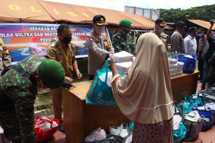 Baksos peduli covid 19 dilaksanakan secara serentak di seluruh Indonesia dan dilaksanakan gabungan personel Polda Sultra Bhayangkari Polda Sultra dan TNI dengan tujuan untuk meringankan beban masyarakat dri dampak covid-19. Jumlah 5467 paket sembako, masker 1000 buah
