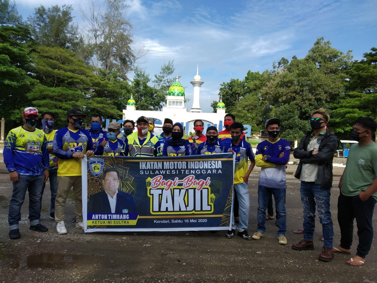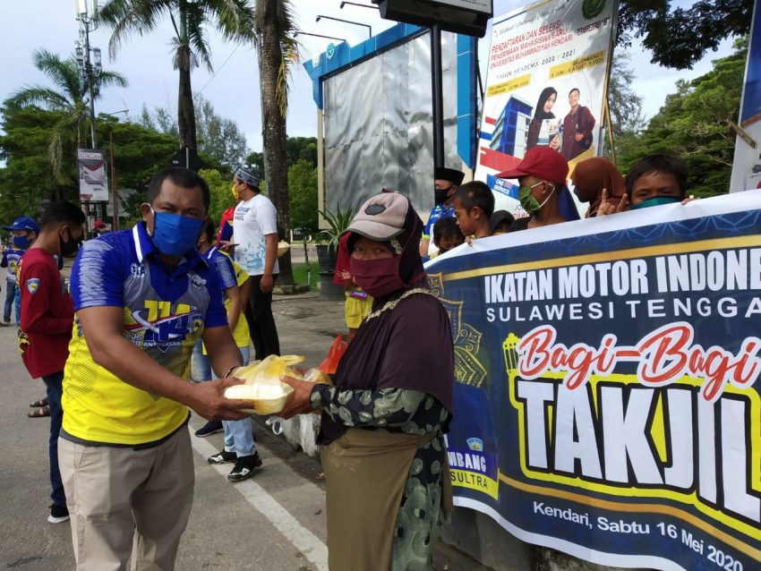 KENDARI– Pengurus Ikatan Motor Indonesia (IMI) Provinsi Sulawesi Tenggara berbagi takjil dan masker untuk pengguna jalan di Kota Kendari, Sabtu (16/5/2020).Beberapa titik yang disasar adalah kawasan Lampu Merah Eks-MTQ dan Bundaran Tank Anduonohu Kendari.