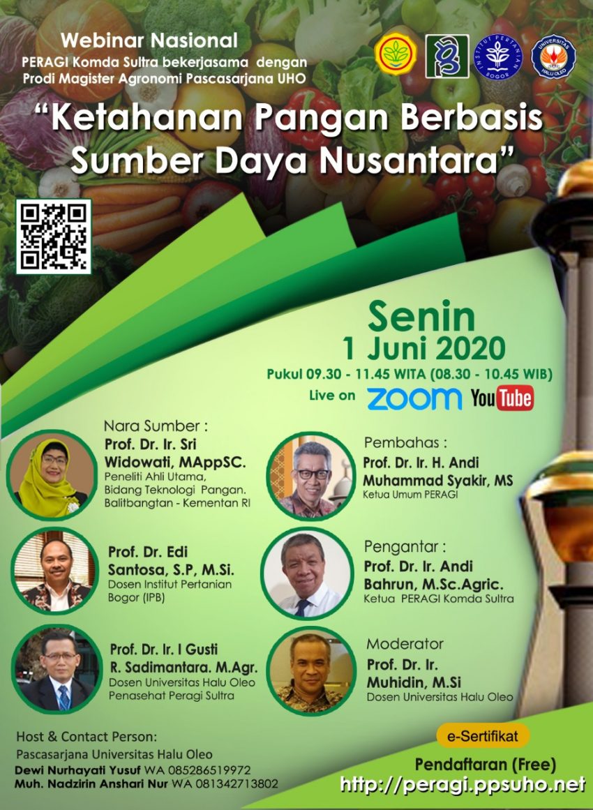 KENDARI- Perhimpunan Agronomi Indonesia ( PERAGI) Komda Sultra mengandeng Program Studi (Prodi) Srata Magister (S2) Agronomi Pascasarjana Universitas Halu Oleo (UHO) menggelar Webinar dengan tema” Ketahanan Pangan Berbasis Sumber Daya Nusantara”.