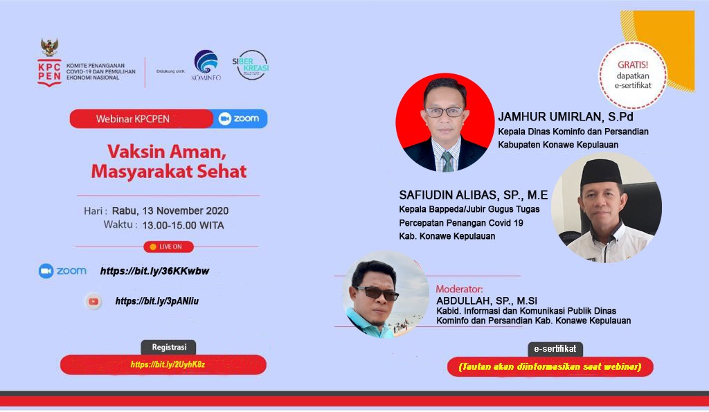 KONAWE KEPULAUAN – Dinas Komunikasi Informatika (Kominfo) dan Persandian Kabupaten Konawe Kepulauan (Konkep) bekerjasama dengan Komite Penanganan COVID-19 dan Pemulihan Ekonomi Nasional (KPCPEN) akan menggelar Webinar bertema “Vaksin Aman, Masyarakat Sehat”. Kegiatan ini akan diselenggaran pada Rabu (18/11/2020).