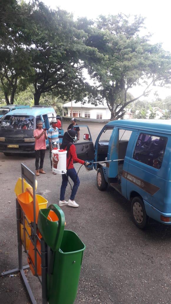 Nampak Apriliani Puspitawati turun langsung ke lapangan menyemprot desinfektan di beberapa mobil angkot, menyemprot bagian tempat sopir, dan tempat duduk penumpang.