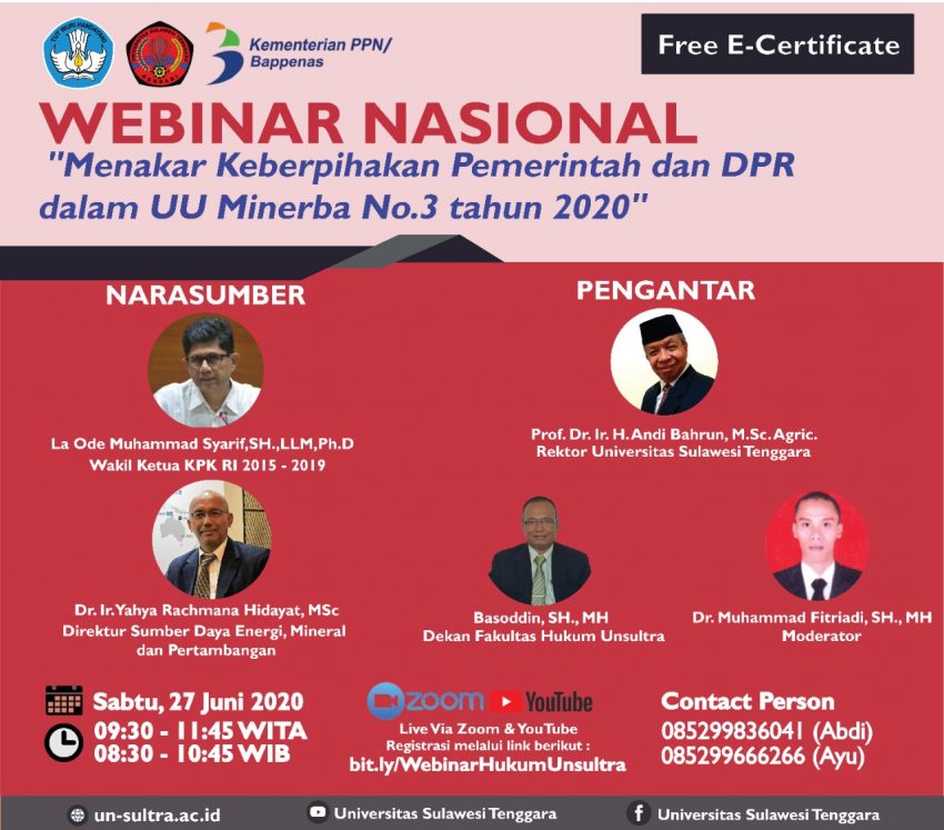 Termasuk bagaimana pula dengan peran pemerintah daerah,terutama berbagai produk peraturan turunannya. jelas berbagai hal yang substansi dan harapan terhadap UU MinerbaNo 3 Tahun 2020 , khususnya terkait peran dan keberpihakan pemerintah dan DPR dalam UU Minerba No 3 2020, hari ini Fakultas Hukum Unsultra mengadakan Webinar bertajuk “Menakar Keberpihakan Pemerintah dan DPR dalam Undang-Undang Minerba Nomor 3 Tahun 2020″.